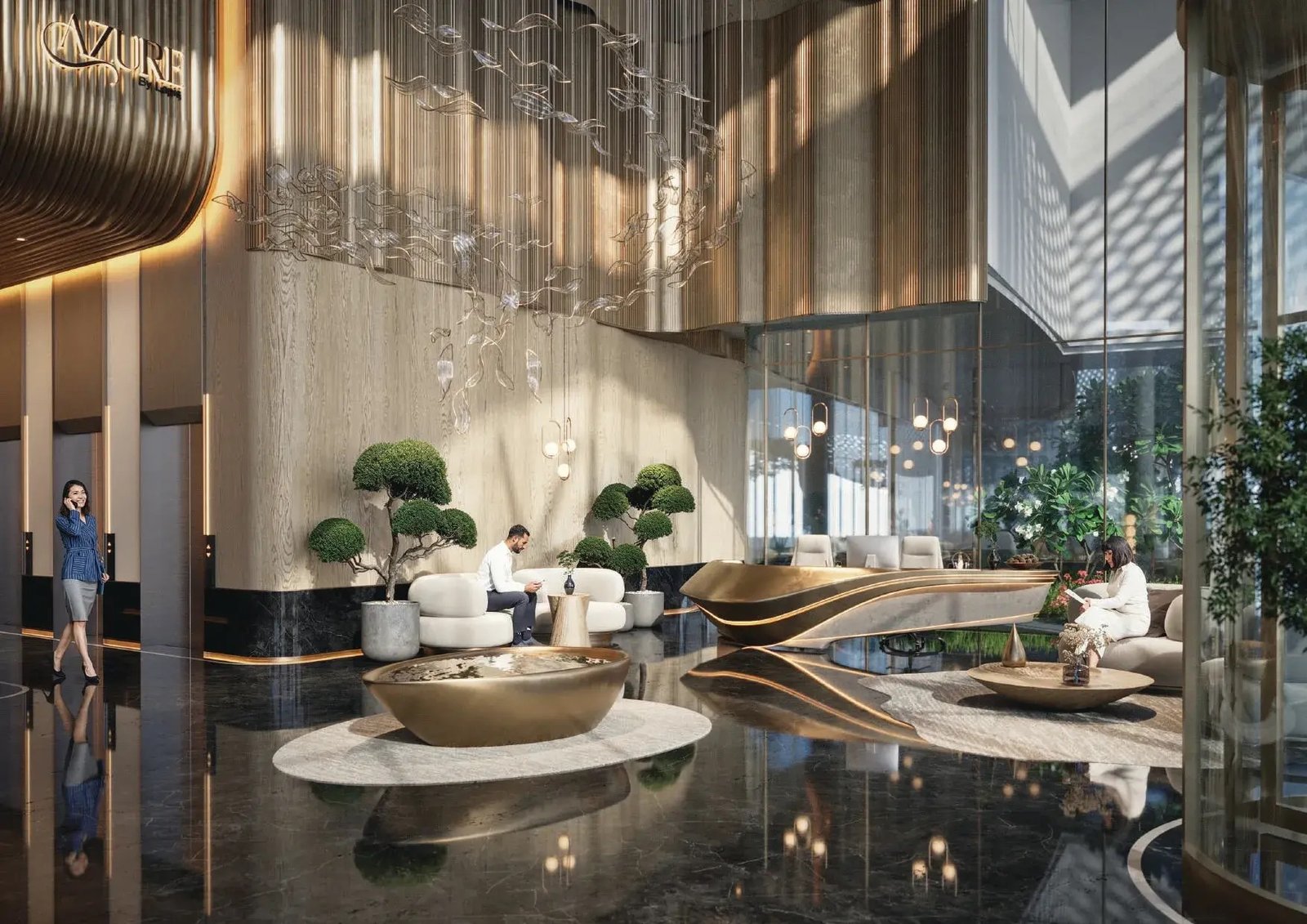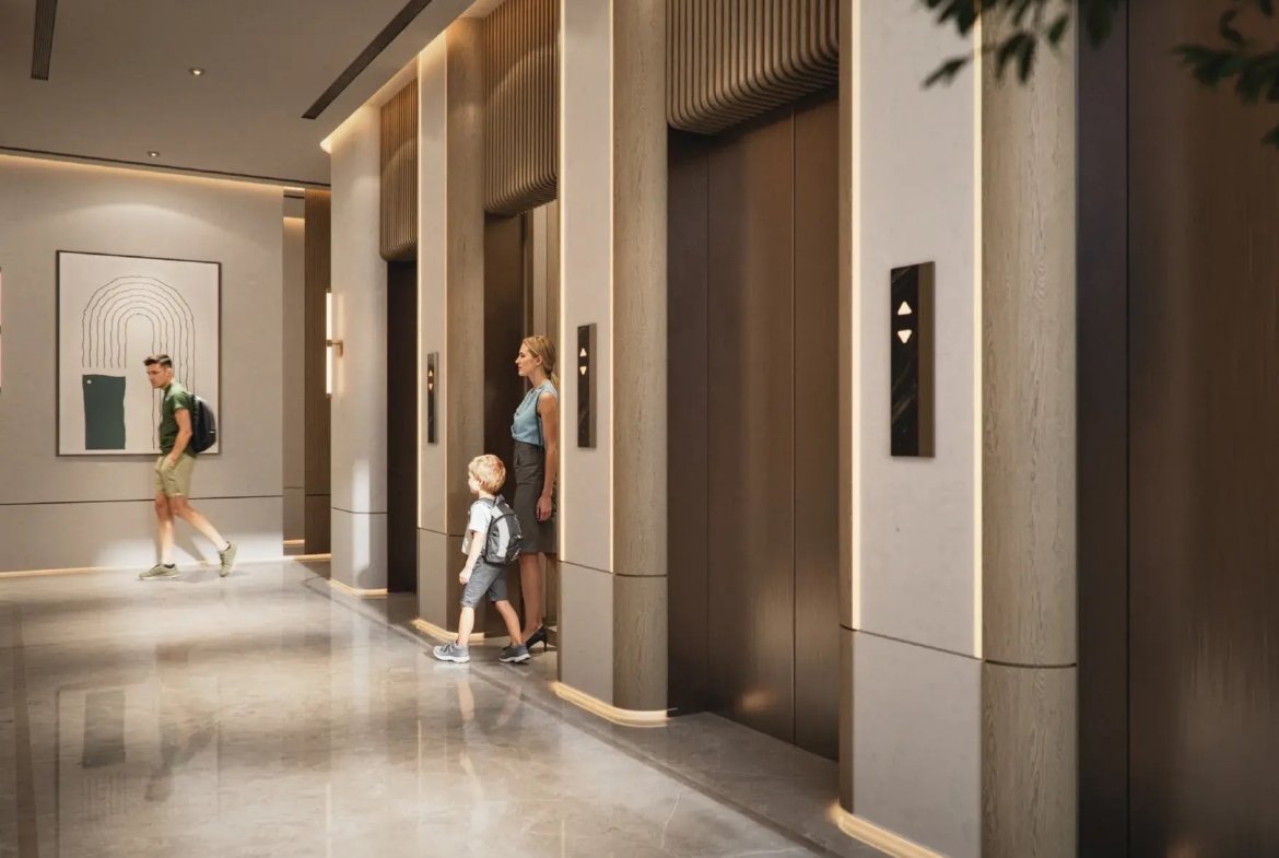 The interiors of Azure are defined by premium materials, modern finishes, and refined decorative elements that mirror the project’s calm, elevated character. The lobby showcases polished surfaces, soft lighting, and warm textures, creating an inviting sense of arrival. Residences feature contemporary design details with clean lines and elegant tones.