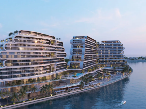 Azure by Lapis rises on Al Marjan Island as a refined waterfront landmark shaped around tranquility, nature, and architectural elegance. Its curved silhouette, expansive terraces, and flowing lines echo the meeting point of sea and sky, creating a serene visual identity that reflects the calm rhythm of coastal living. The tower stands within one of Ras Al Khaimah’s most prestigious island destinations, surrounded by beaches, promenades, and resort landscapes.