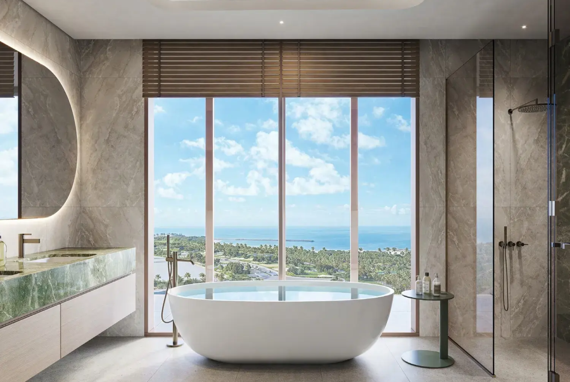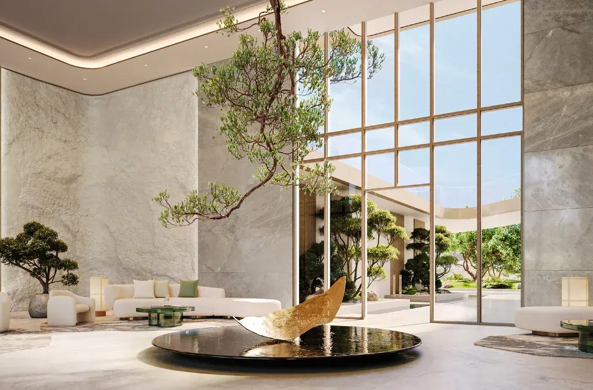 Interiors at Hado are defined by elemental, nature-inspired materials and a calm, contemporary aesthetic influenced by Japanese principles of simplicity and harmony. Finishes feature a refined palette of stone, warm timber, brushed metal accents, and soft textured surfaces, complemented by generous floor-to-ceiling heights and abundant natural light. Kitchens are crafted as sculptural spaces with stone countertops, timber cabinetry, and subtle metal detailing, designed for both functionality and quiet elegance. The residences are delivered unfurnished, allowing owners to personalize their homes while enjoying a high level of material quality, craftsmanship, and timeless design throughout.