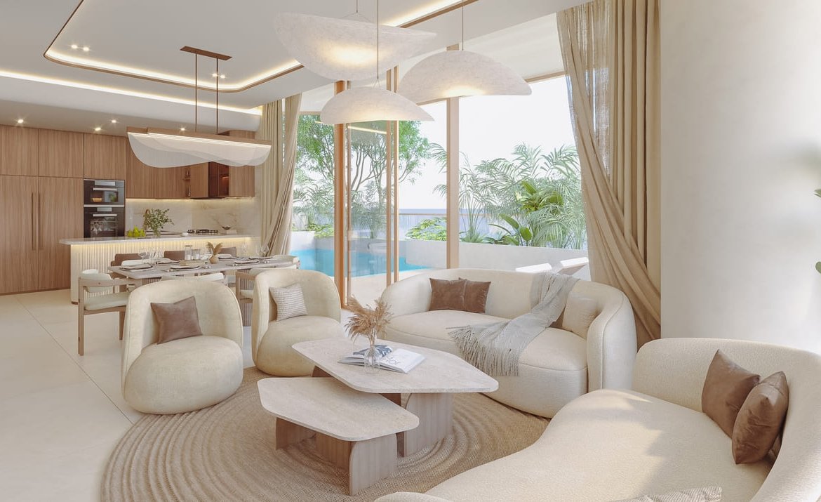 The residences include one-, two-, and three-bedroom apartments, as well as four-bedroom townhouses and penthouses. Each home is fully furnished, thoughtfully designed with open layouts, natural textures, and private outdoor spaces such as terraces, balconies, or even jacuzzis. Complementing the residences, Vestoria Bay Club offers a curated lifestyle across multiple levels — from family pools and kids’ play zones to an open-air cinema, rooftop lounge, wellness terrace, and modern fitness hub. Together, they create a vibrant community atmosphere within an elegant coastal retreat.